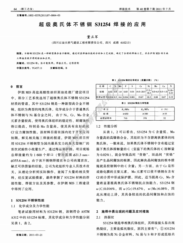 超级奥氏体不锈钢S31254焊接的应用